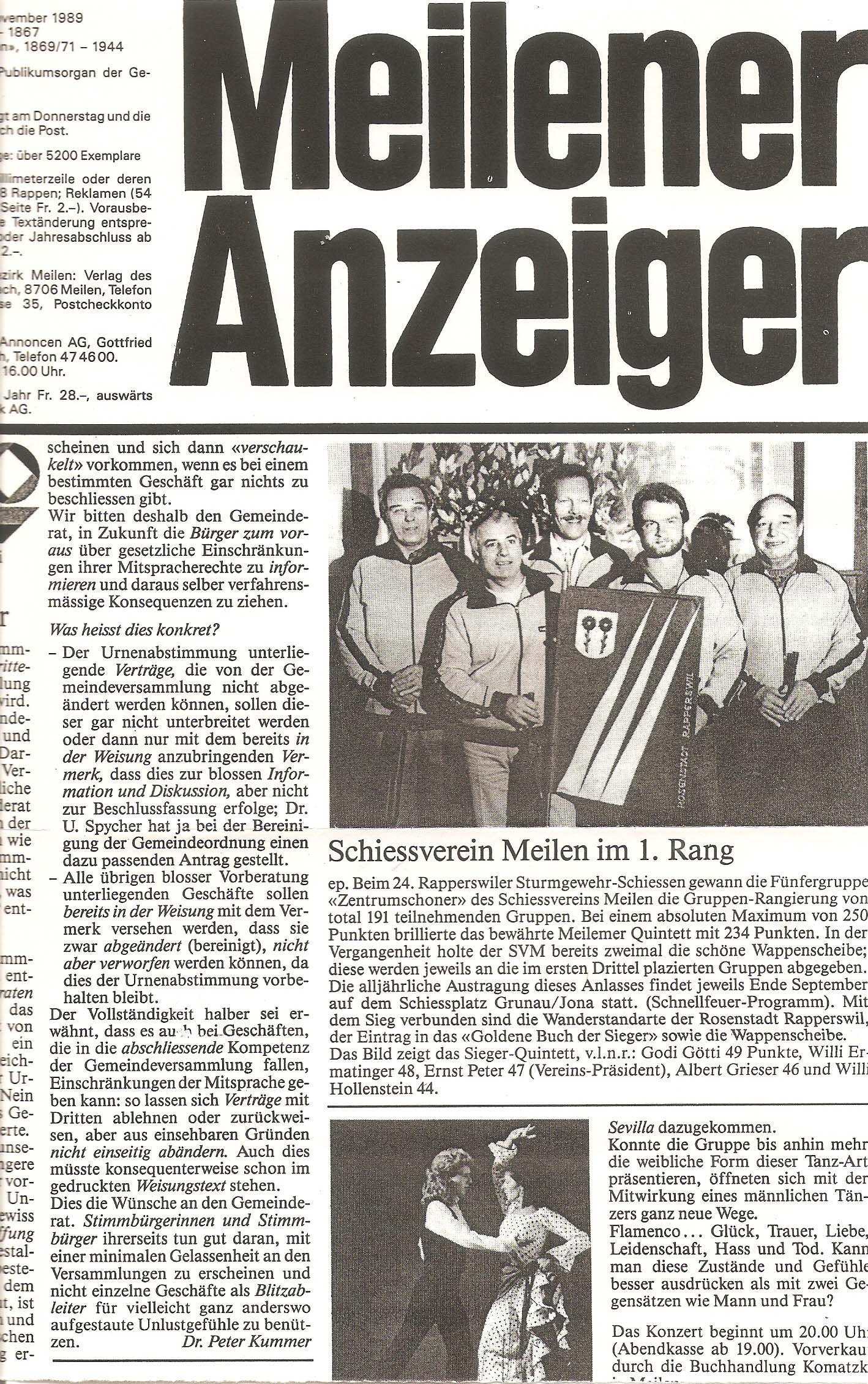 Links nach rechts: Götti Gody, Willi Ermatinger, Ernst Peter, Albert Grieser, Willi Holenstein. Link zum Artikel im Meilemer Anzeiger. |